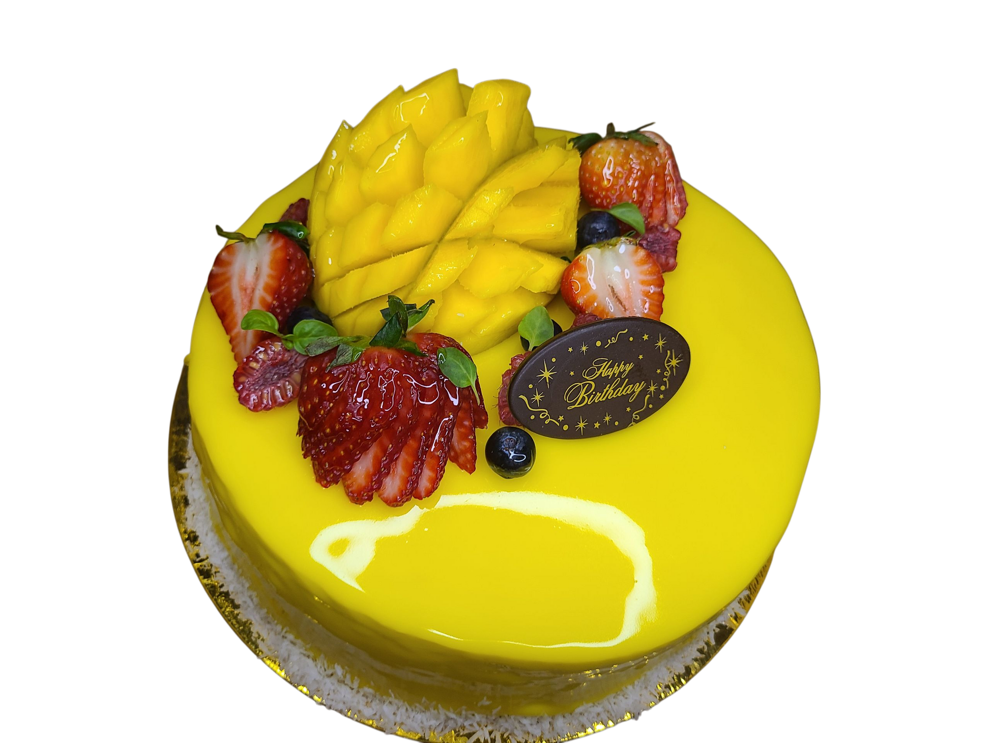 Vanilla swiss cake layered with infused with ripe mango mousse and mango gelee. Garnished with mango, berries and coconut flakes.
